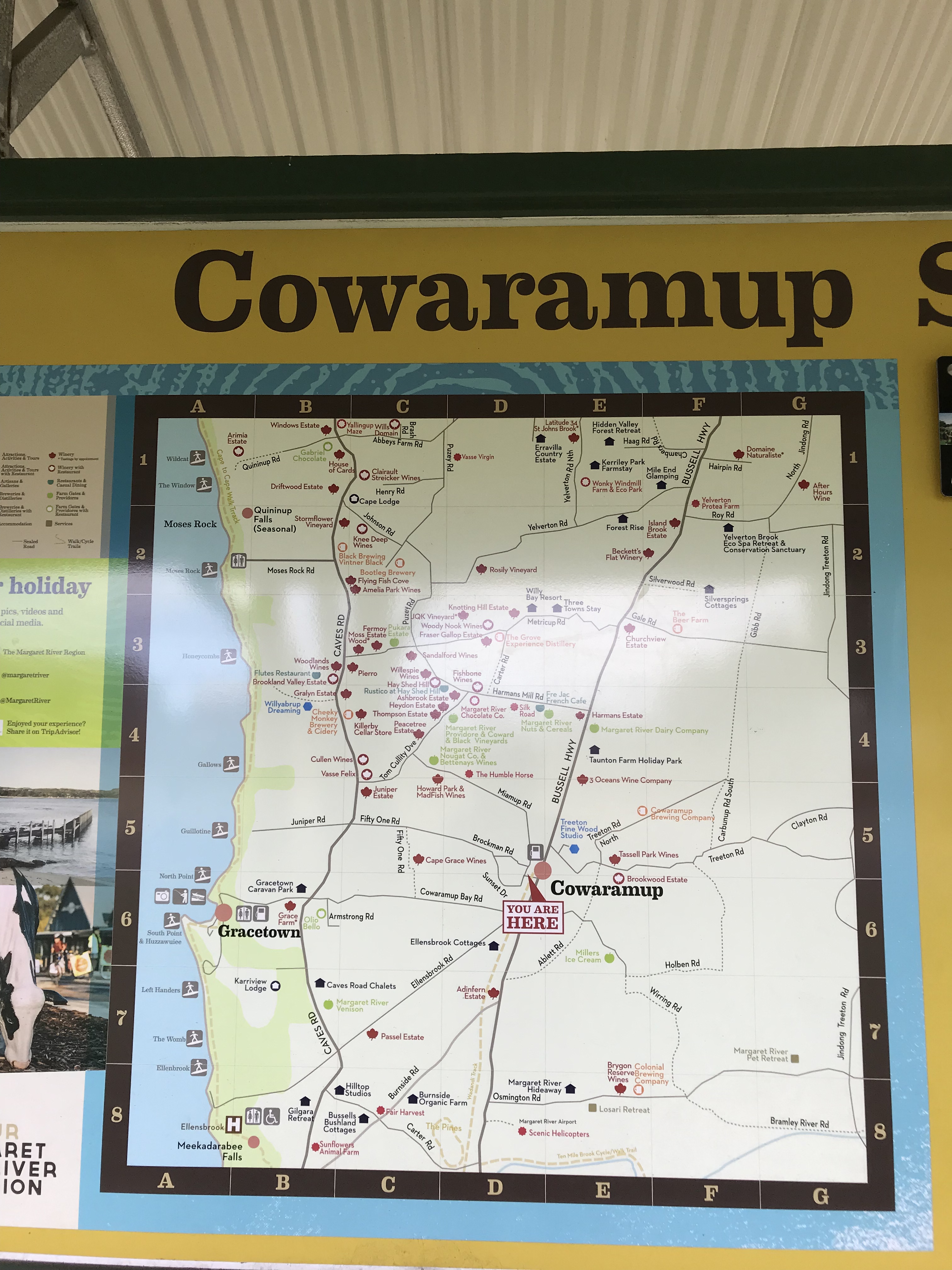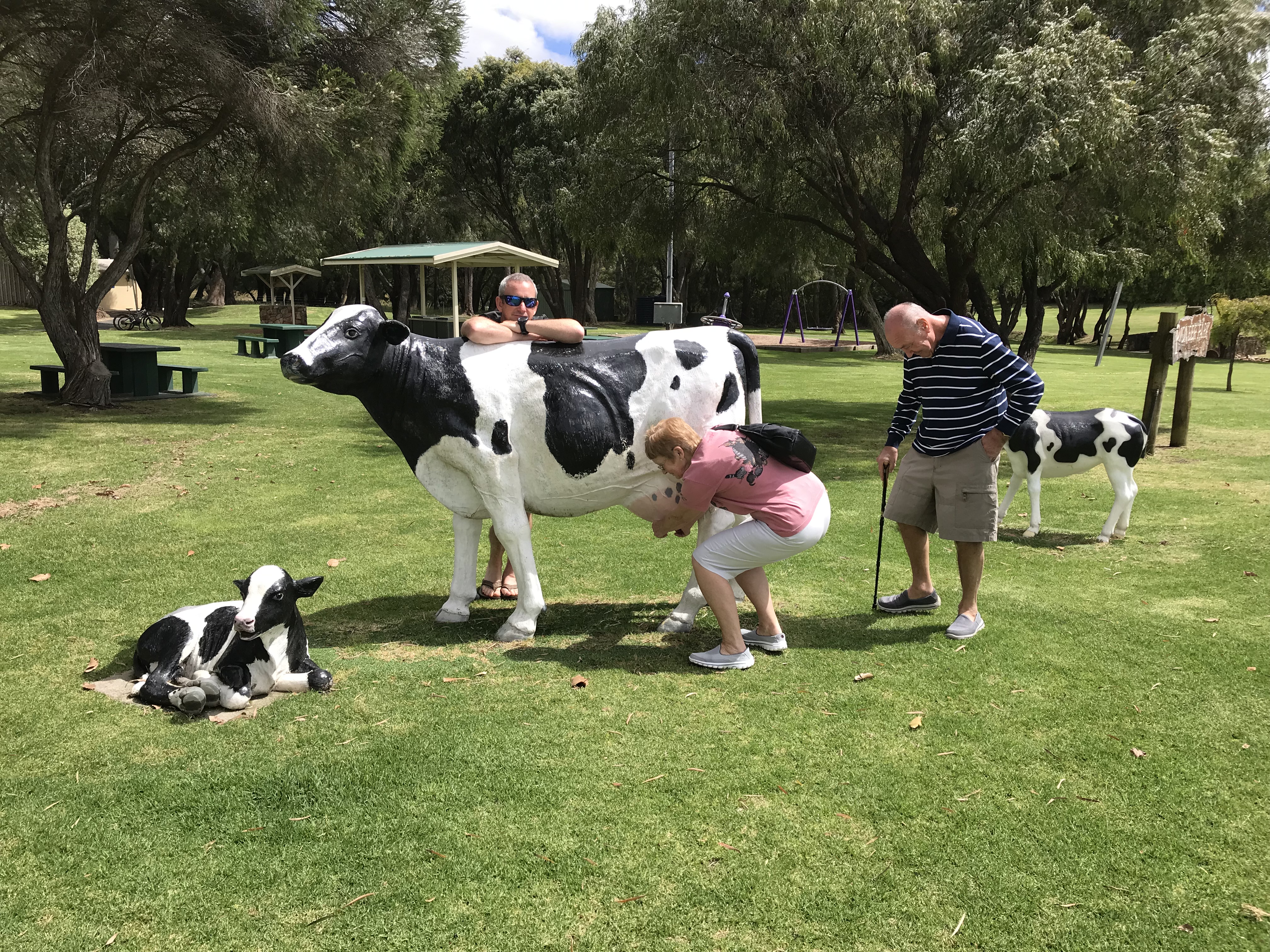 After a fun evening around the wood burning stove, meeting other campers and toasting marshmallows, we set off early to take a look at “Cowtown”. Also known as Cowarumup, the town has created a fun landscape of Friesian cows everywhere, so we stopped and had a look in the local park, hung with the cows and admired the roast on the post – a golden cow at the top of a tall pole!