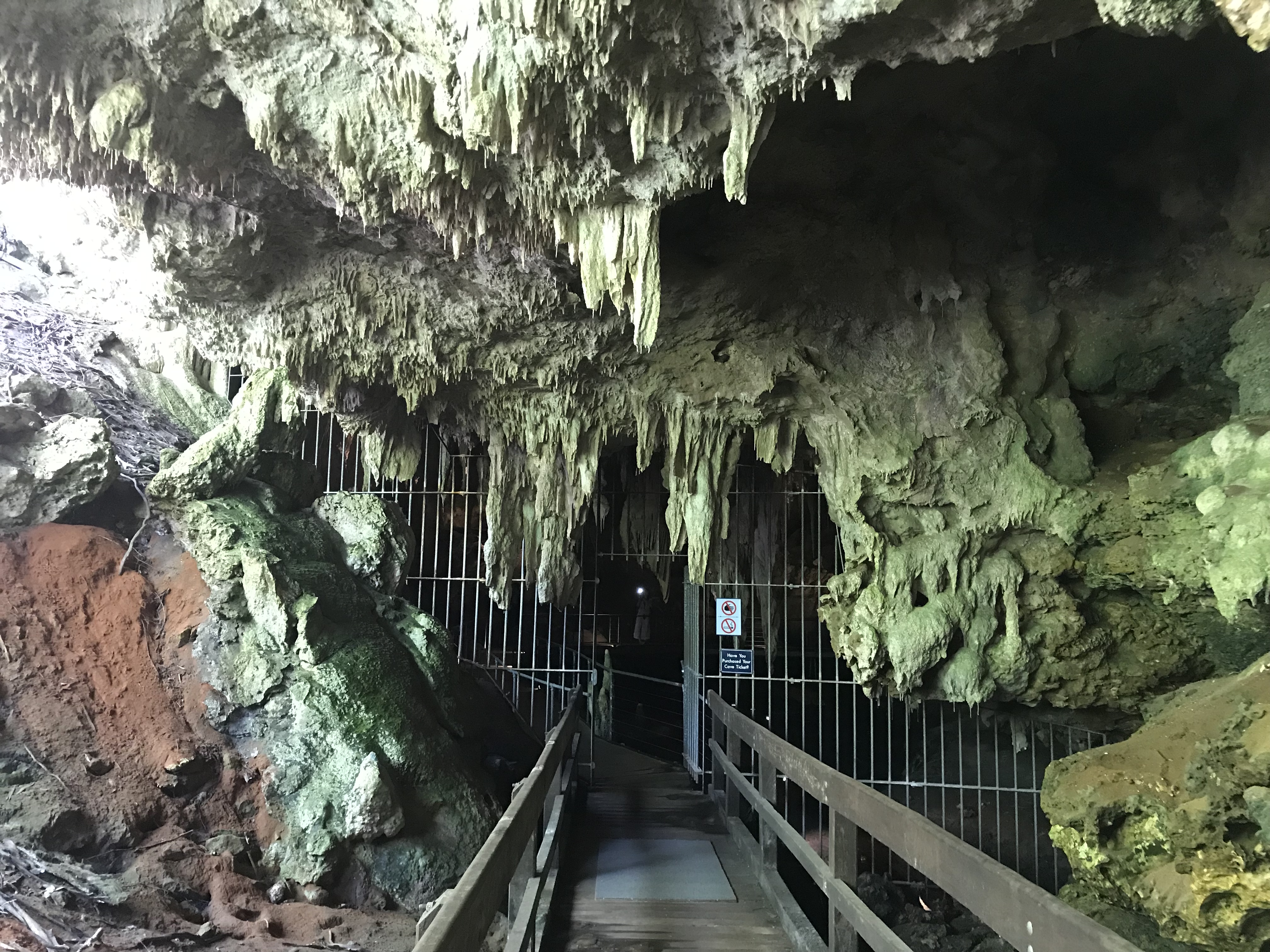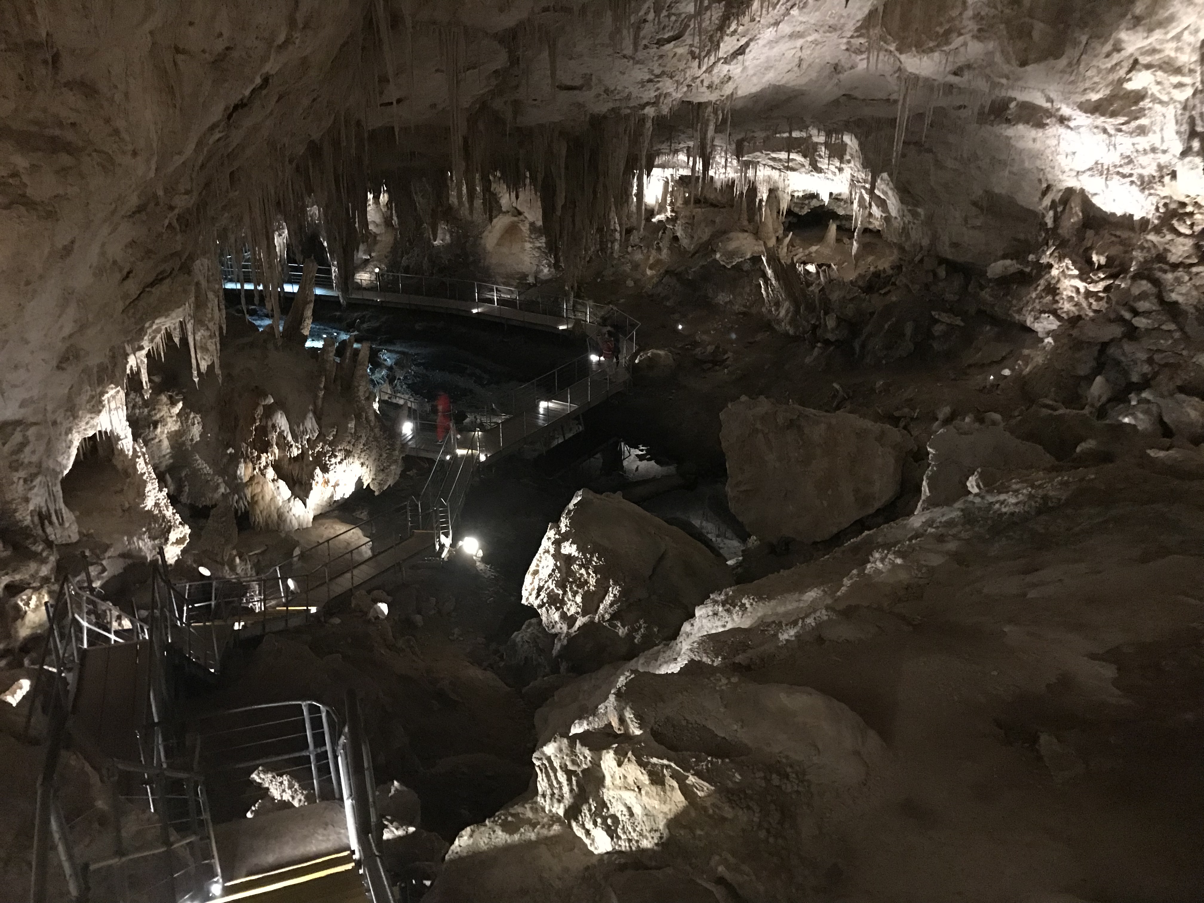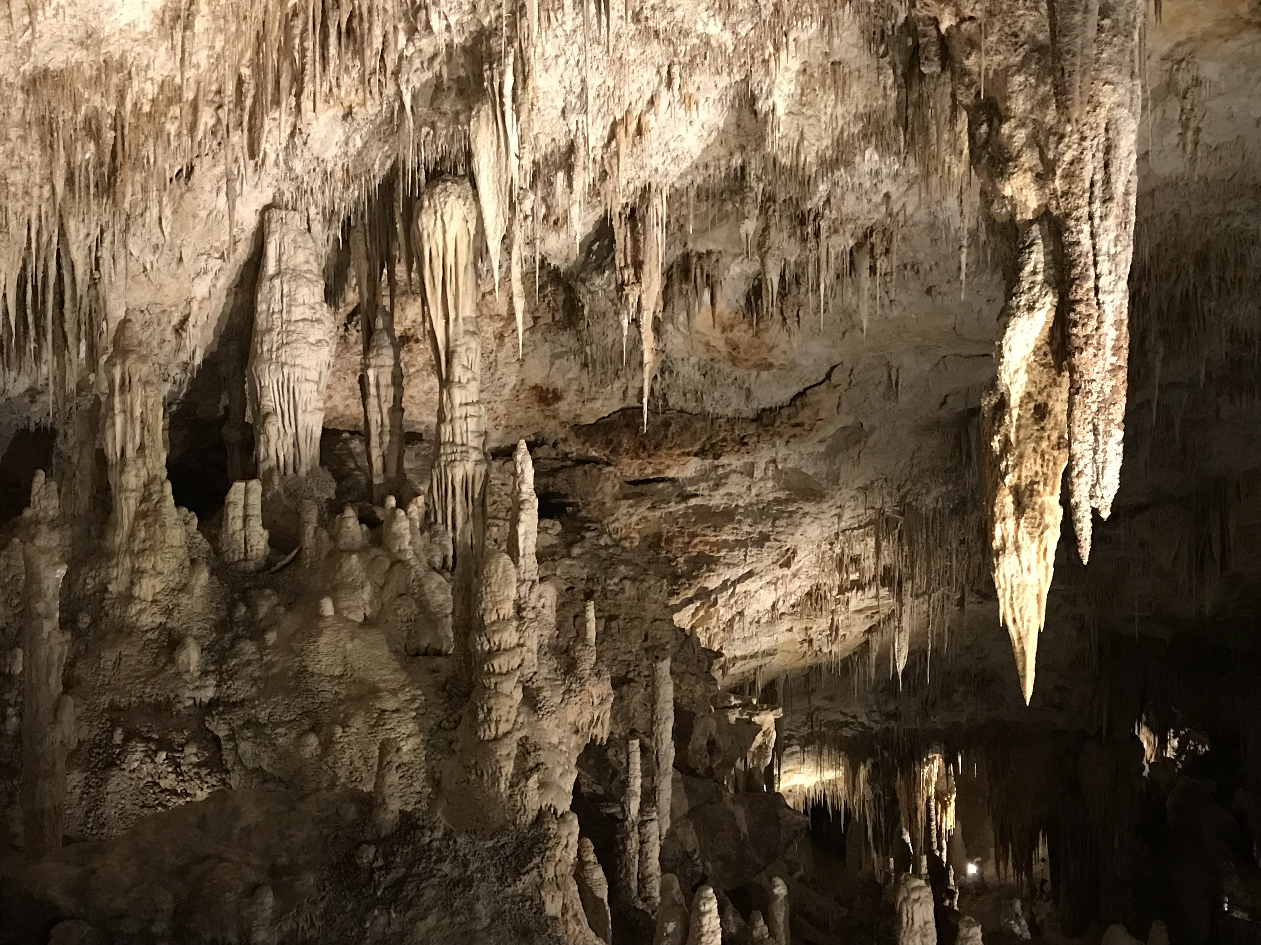 Mammoth Cave was much bigger than Lake Cave, consisting of four separate caverns interlinked through narrow crevices. The many types of structures decorating the interior were on a grander scale than Lake, and in particular a fabulous shawl formation, backlit to show the various colours, was particularly impressive. There were many fully formed pillars, where stalactites and stalagmites had met, as well as incredible areas of crystal flow and many chandeliers of straw like “young” stalactites. It was a chilly 12 degrees throughout the cave, so it was wonderful to exit into the warm air and begin to warm up.
