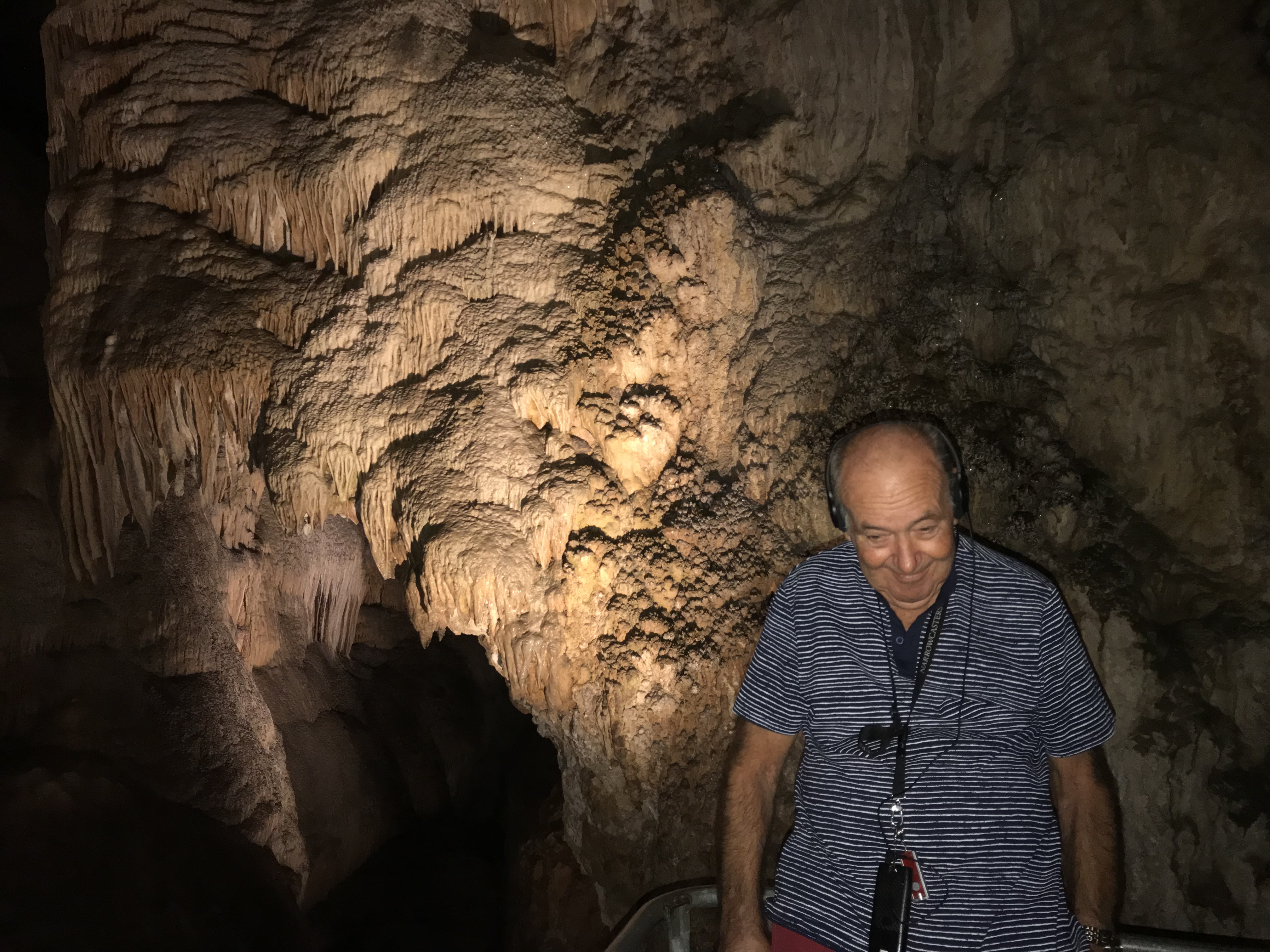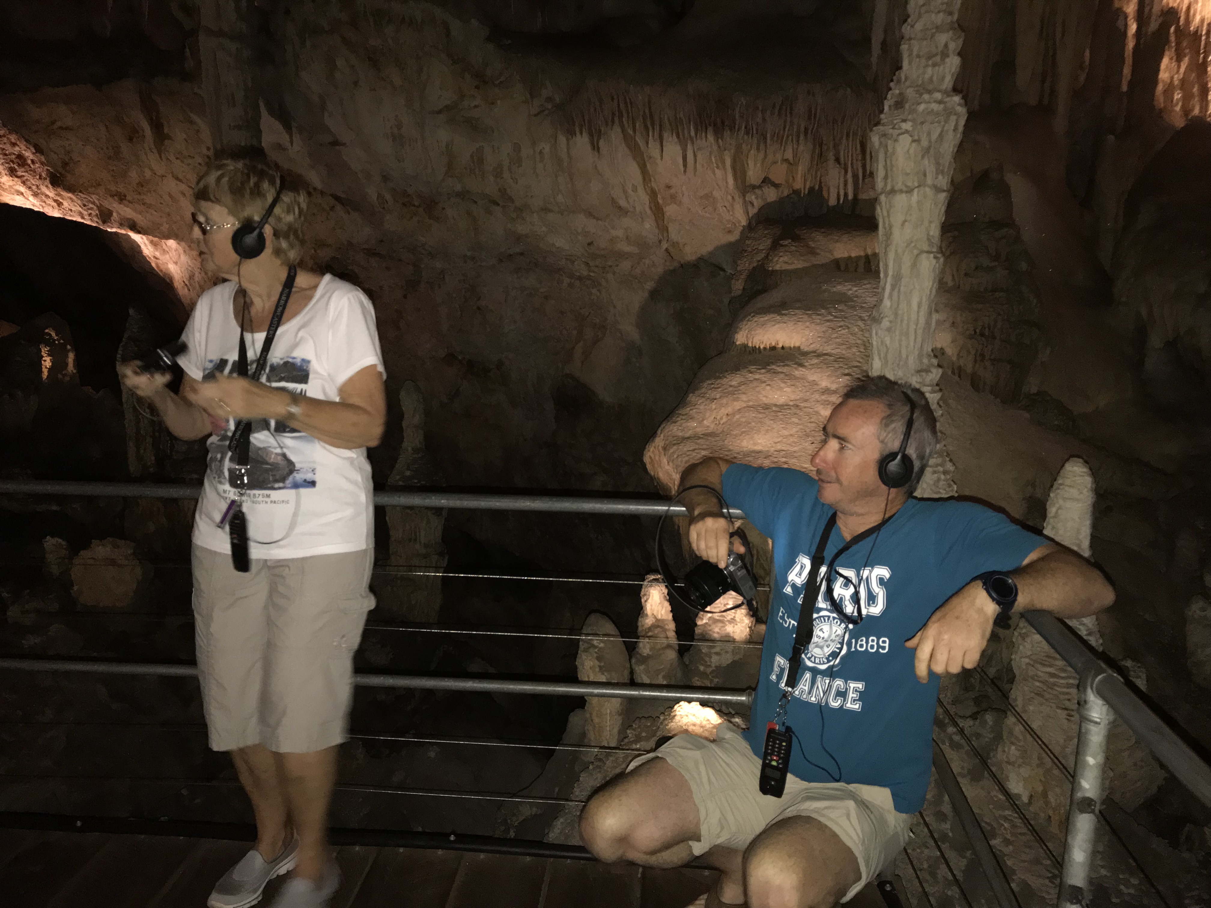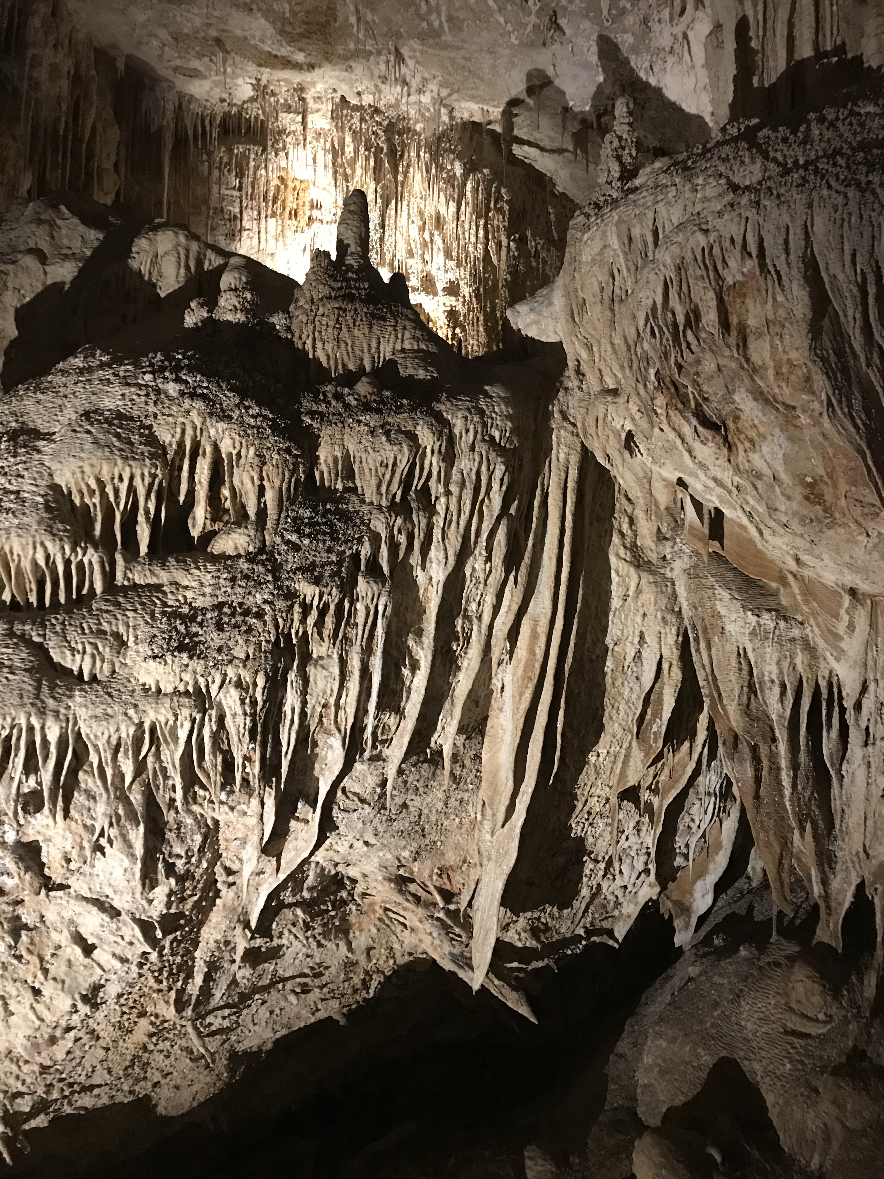 Mammoth Cave was much bigger than Lake Cave, consisting of four separate caverns interlinked through narrow crevices. The many types of structures decorating the interior were on a grander scale than Lake, and in particular a fabulous shawl formation, backlit to show the various colours, was particularly impressive. There were many fully formed pillars, where stalactites and stalagmites had met, as well as incredible areas of crystal flow and many chandeliers of straw like “young” stalactites. It was a chilly 12 degrees throughout the cave, so it was wonderful to exit into the warm air and begin to warm up.
