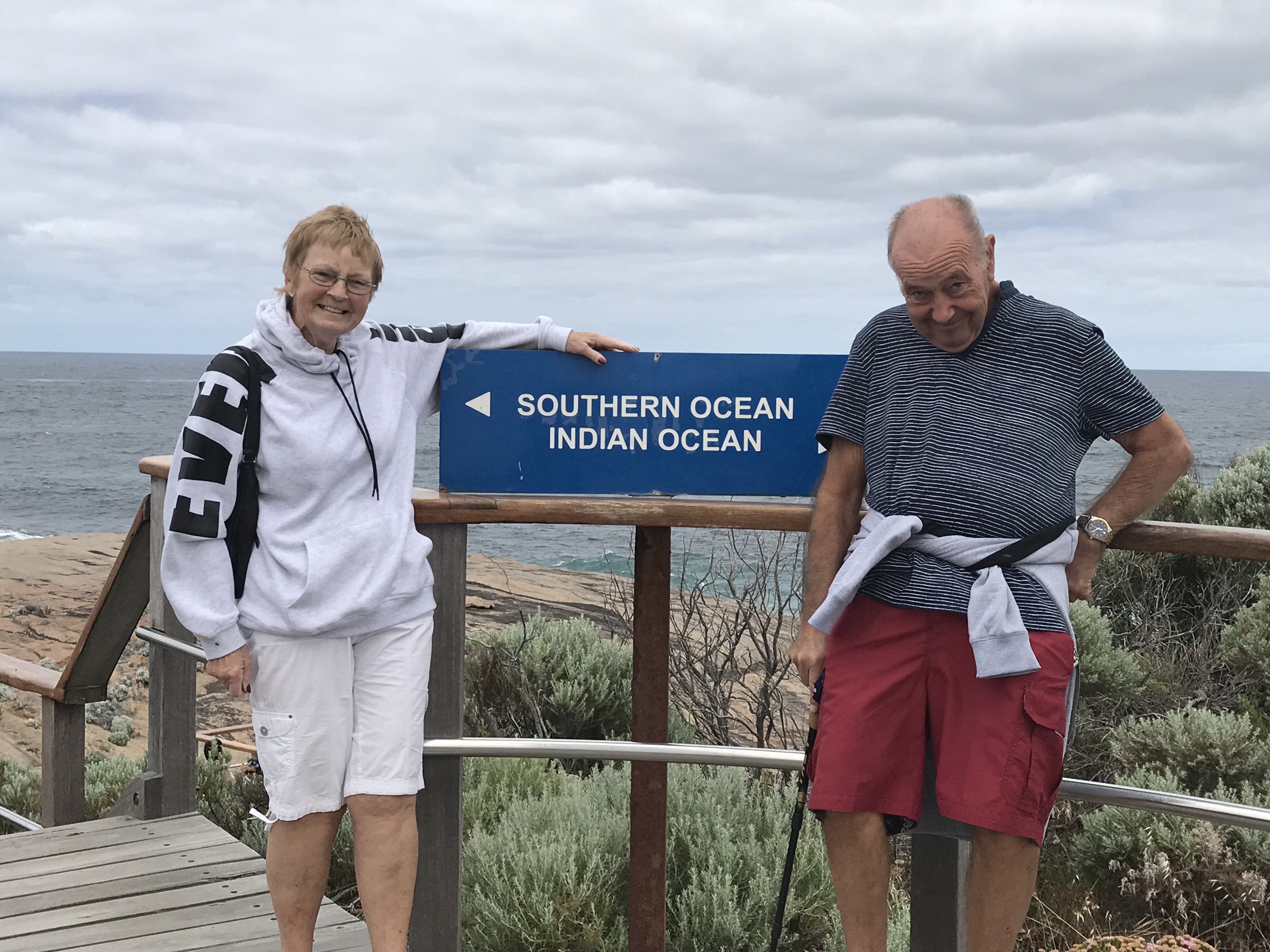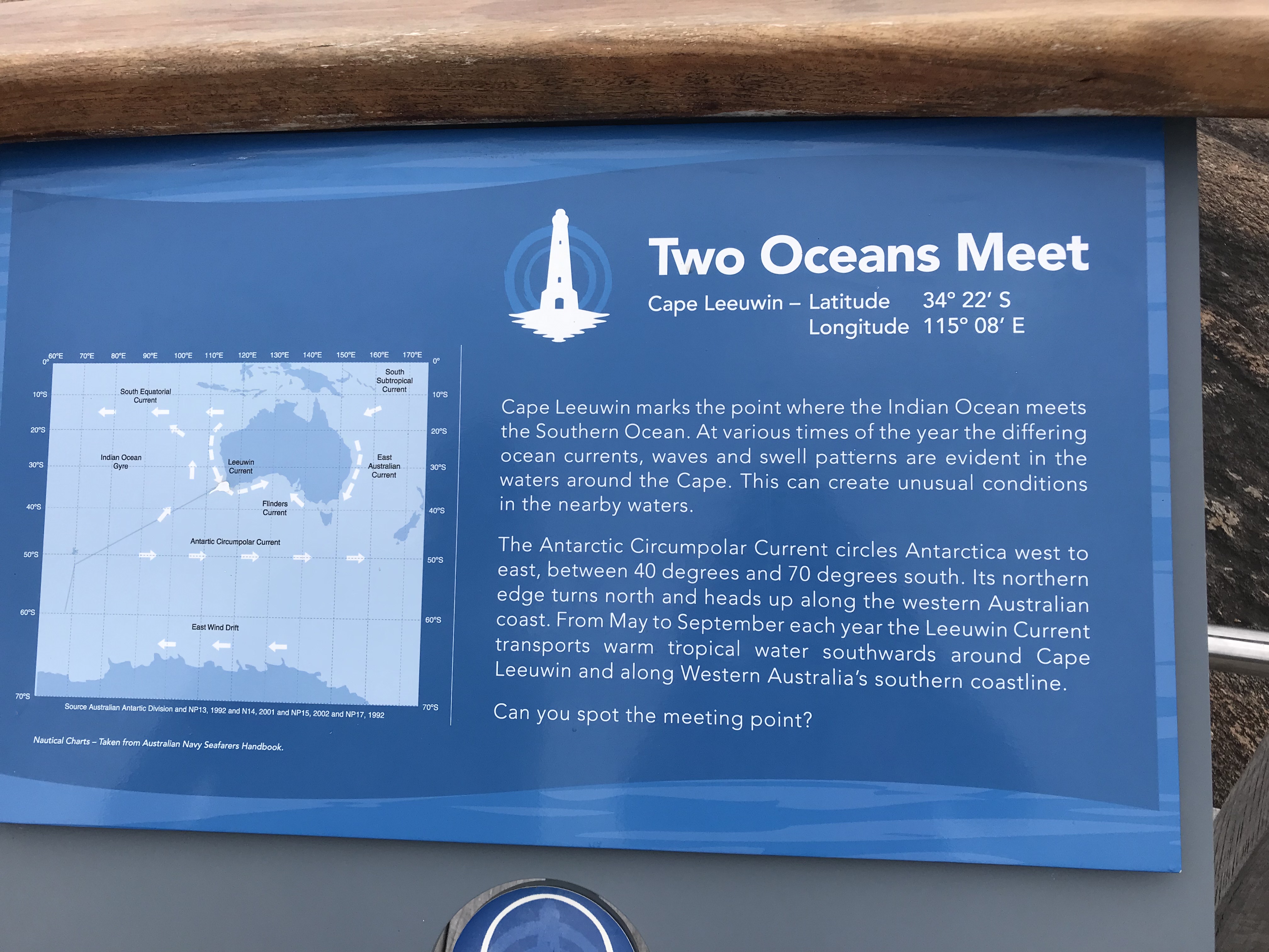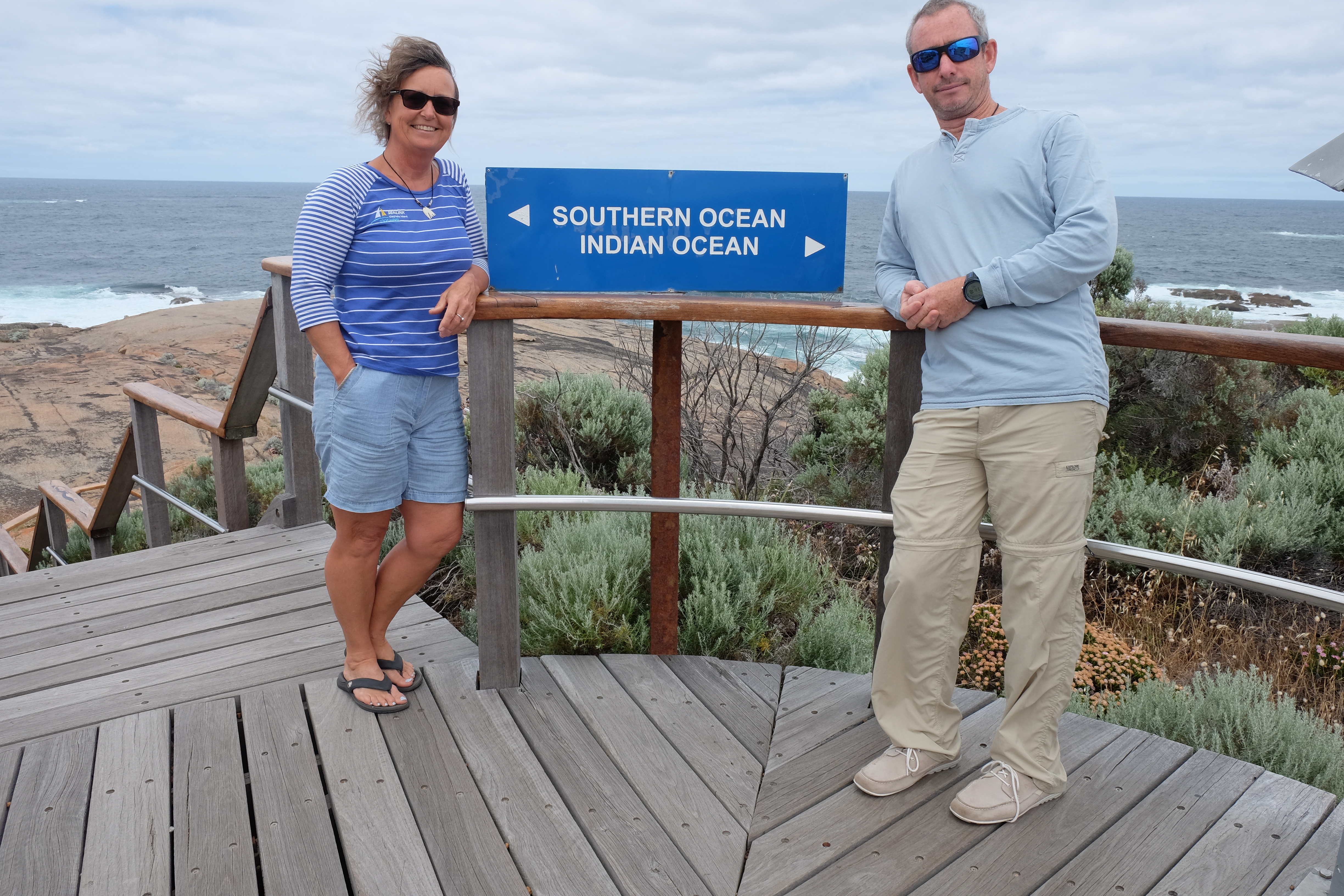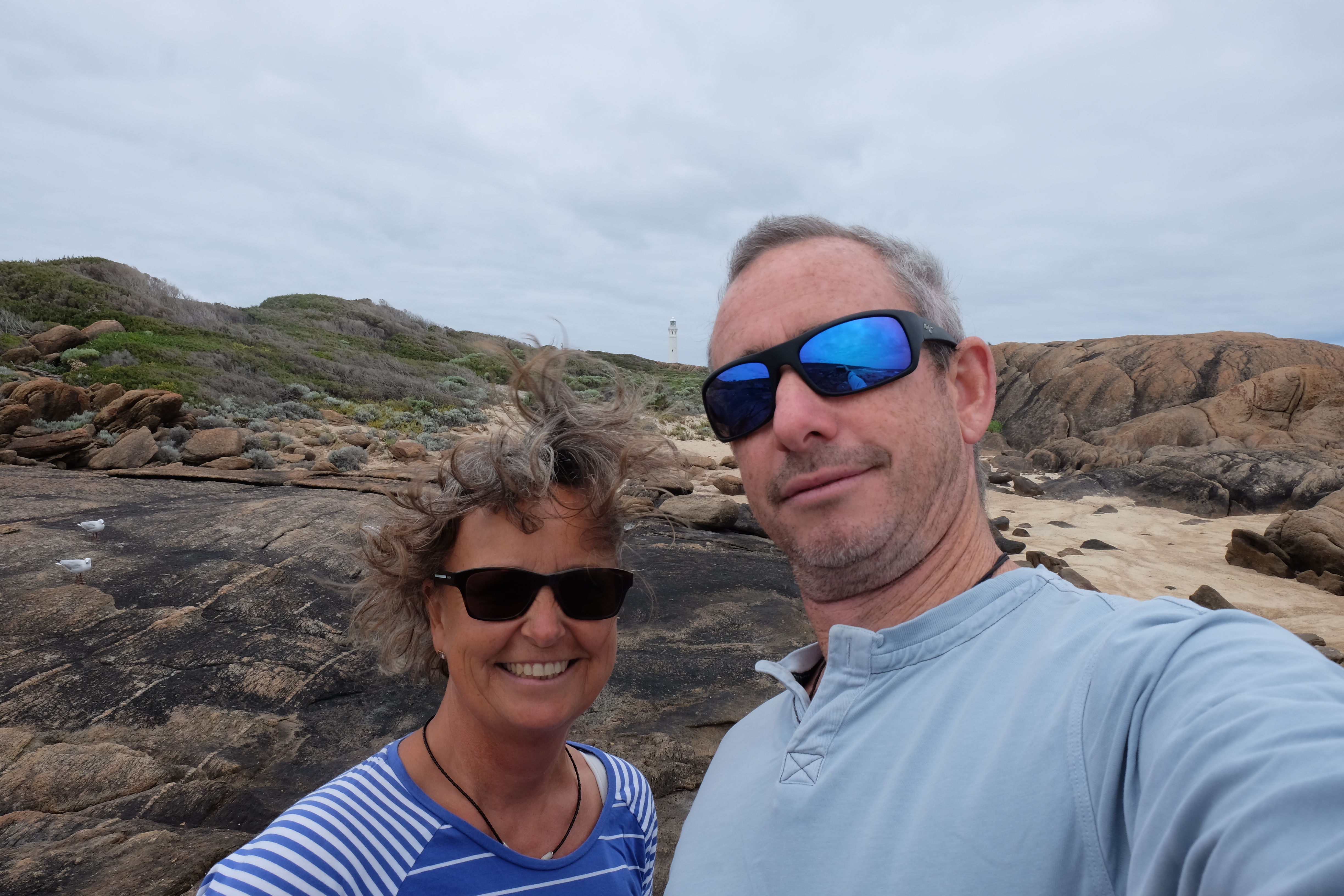 We had a slow start to the day, taking it easy after 2 days of climbing in and out of caves, heading around to Cape Leeuwin around 1100. The weather was warm, but it was very windy, blowing strongly from the west. It was a short drive from the camp, around the coast line of low scrub and bald rock, where its hard to imagine any tree could ever survive. The lighthouse is on a long promontory looking due south to the convergence of the Indian and Southern oceans. Roughly this time last year, Pete and I were at the other end of the continent, looking from Cape York towards Papua New Guinea!
