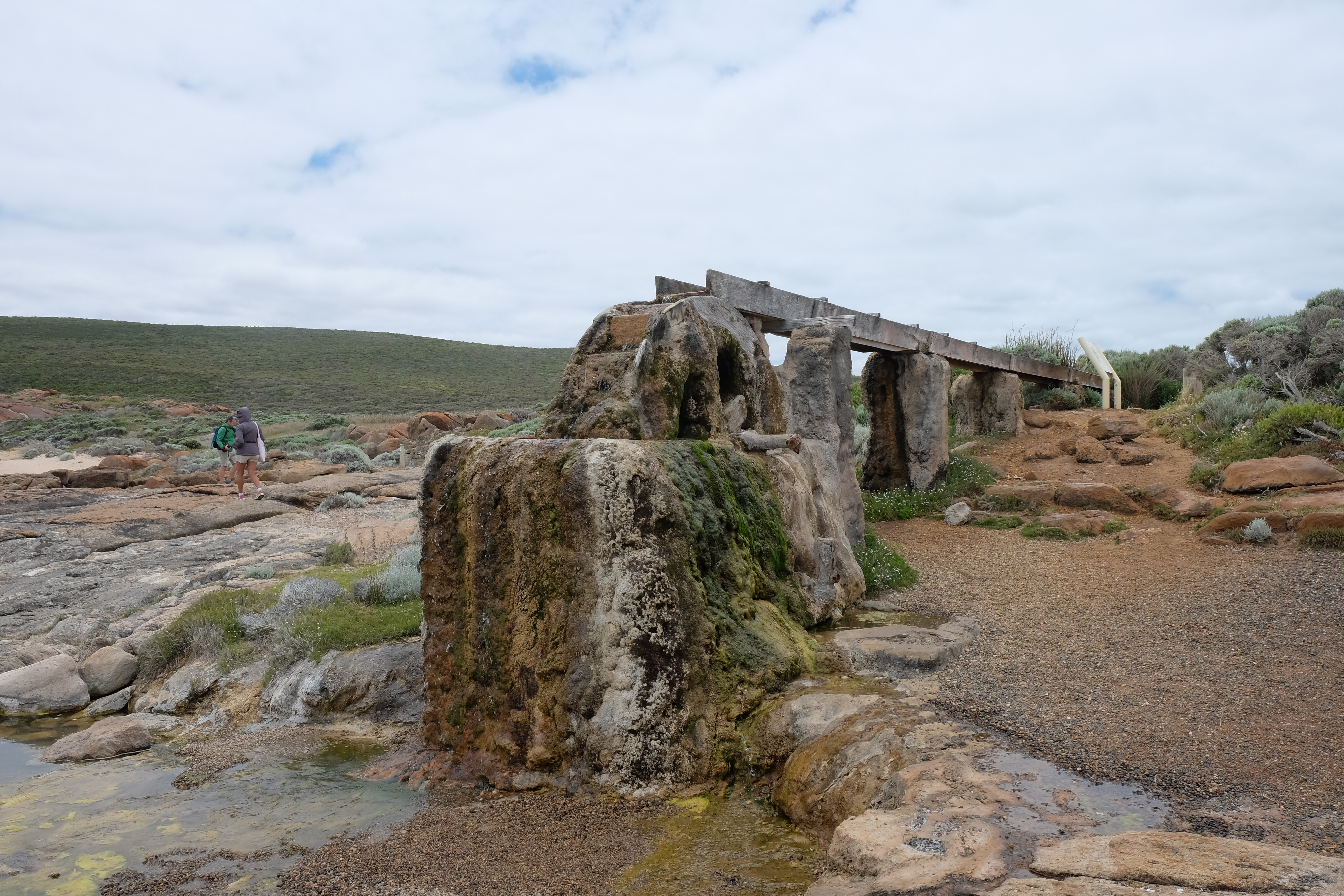 Near the lighthouse precinct are the remains of the water wheel, which brought fresh water from a spring near the tide line, to provide water first for the building mortar, then later for the cottages. The wheel itself is still there, though calcified, so not moving, and the spring is running into the sea.