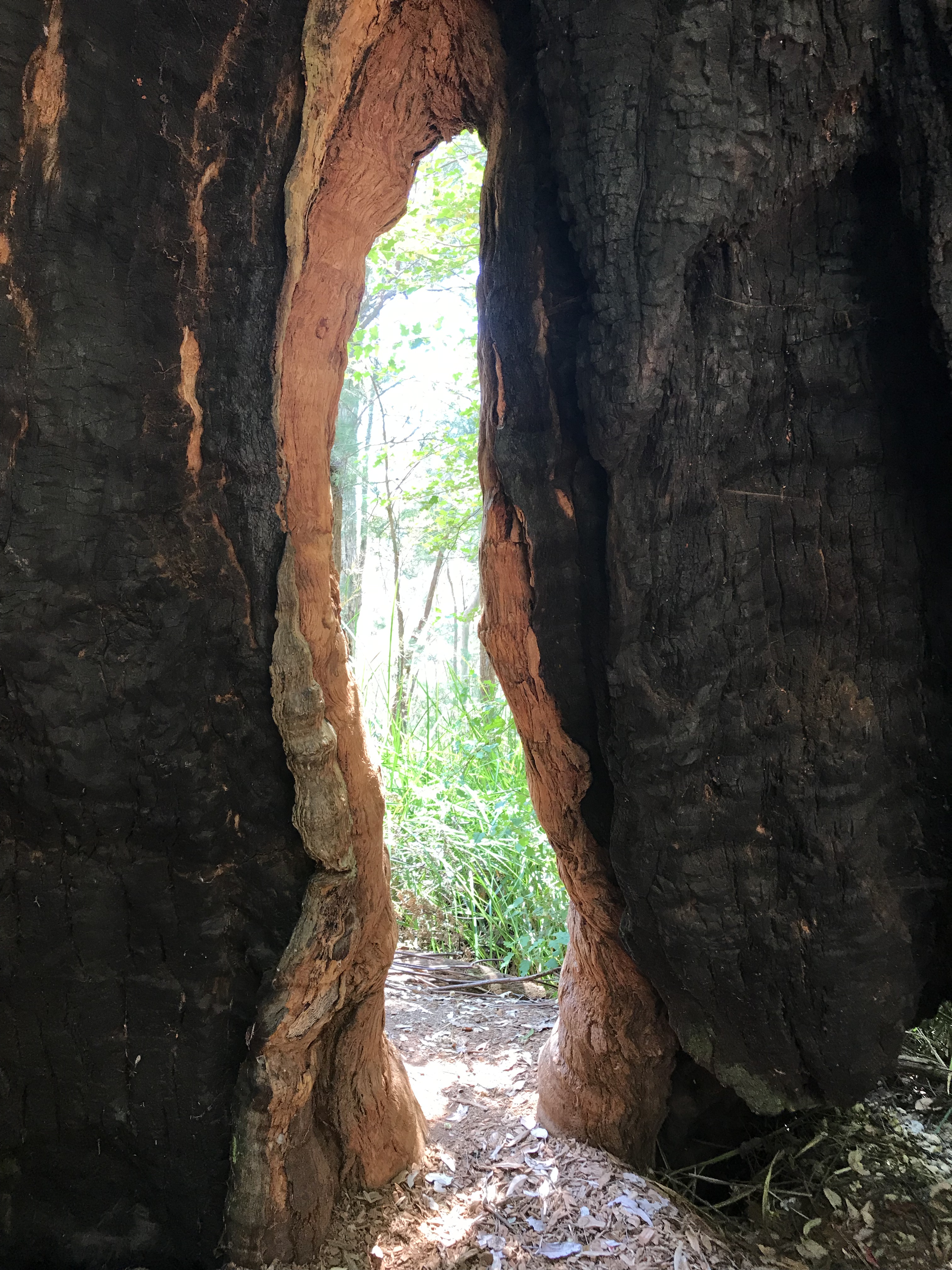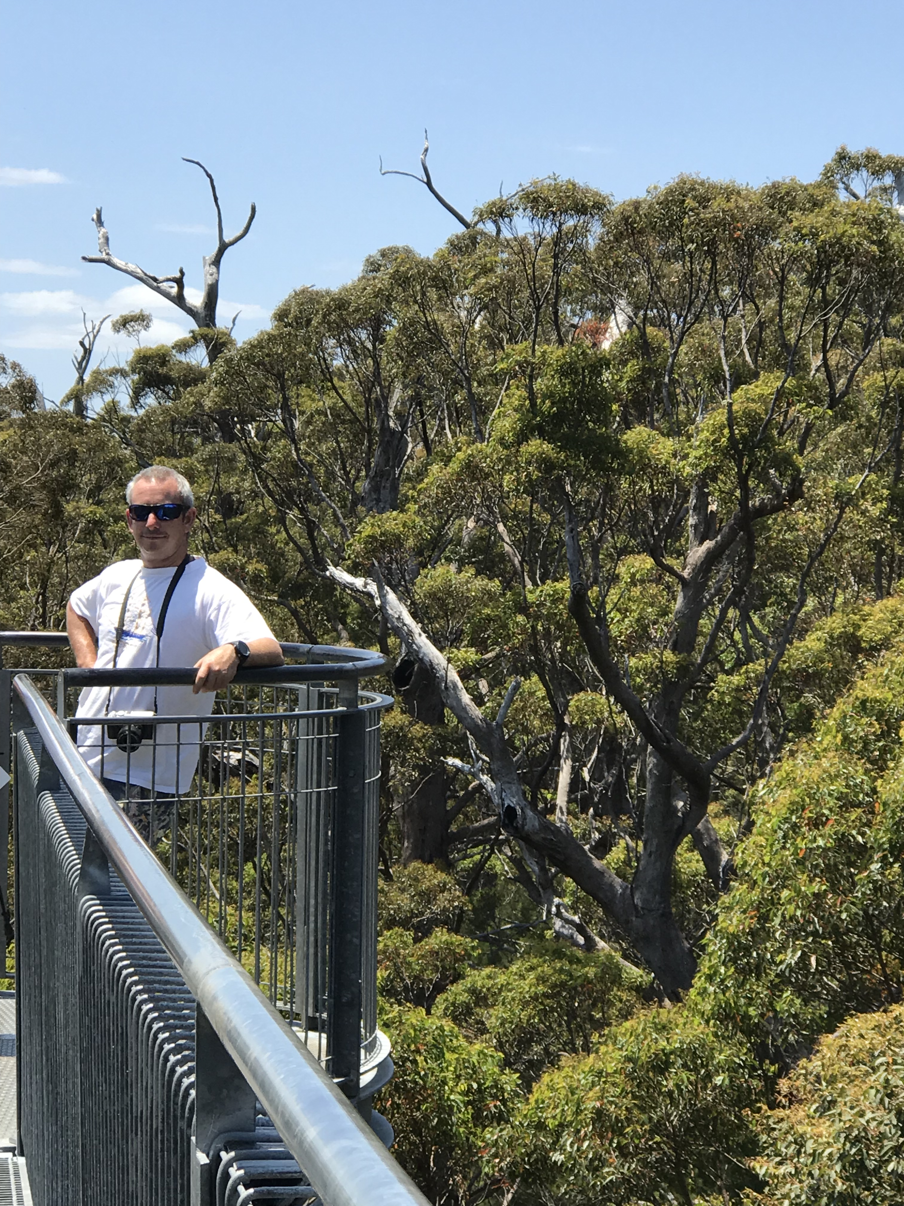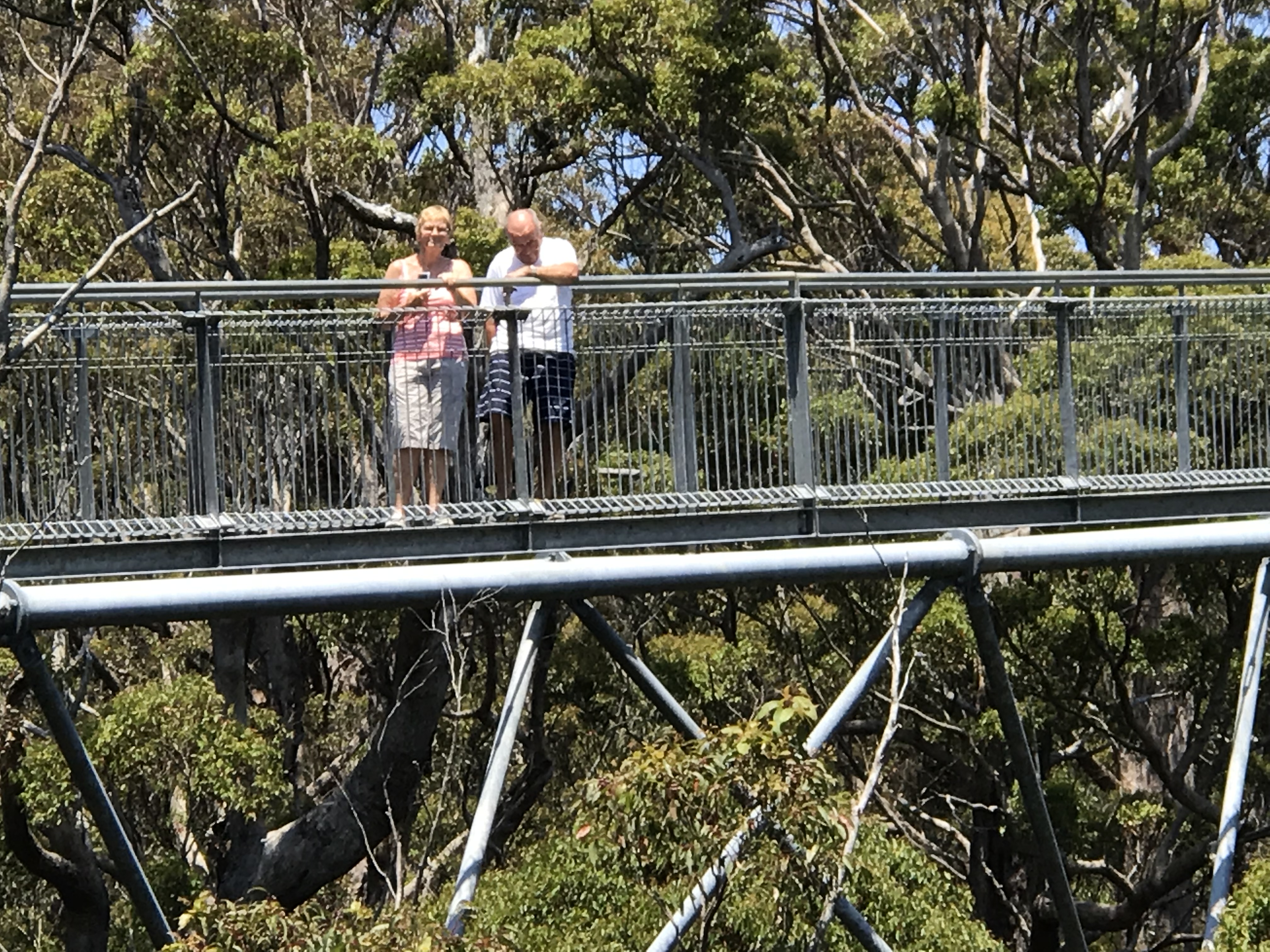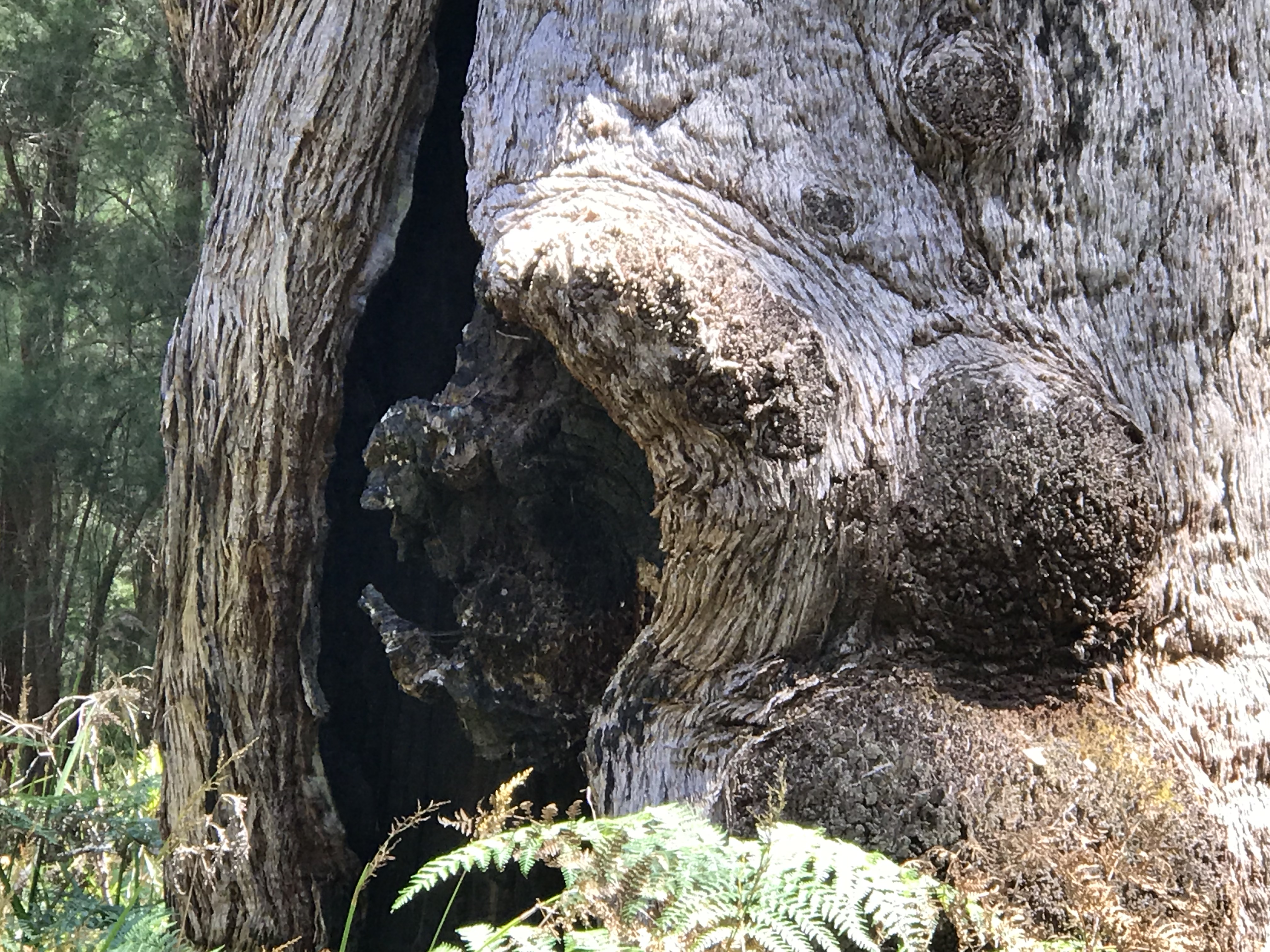 We parked at the Discovrey Centre and entered the suspended walkway that slowly took you skyward towards the canopy. It was a brilliant structure, designed to have the least possible impact on the ground, so as not to disturb the trees, but it swayed unnervingly, though it never felt unsafe. Slowly we ascended past the great trunks, until we wee among the canopy, looking down on birds flying between the trees. It was awesome, and impossible to photograph in any way that would show the splendour of these great trees. Eventually, we made our way back to ground level, and went on the related walk, this time at ground level, through so every old forest. Incredibly old trees inhabited this part of the forest, including. Grandma Timgle, a 400 year old tree with a gnarled face in the trunk, and Kimg Tingle, a majestic, tall tree. We also saw many “walk through” trees, where the trunk had been eaten away by fungi or fire and you could actually walk through the resulting space.