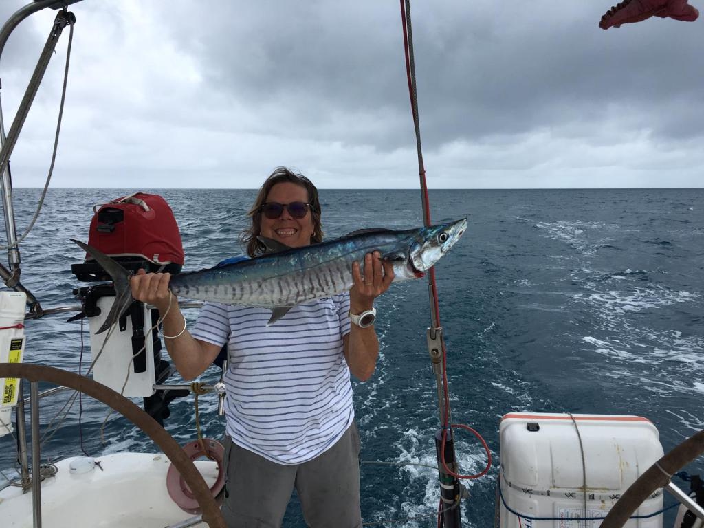 We weighed anchor at 0630 for the final 72nm. Having finally learnt we set just one fishing line and FINALLY got dividends. Lindy landed this handy sized Spanish Mackerel at about midday. We rang ahead to Paul and Clare Ley on Magnetic Island to let them know we had dinner sorted for the assembled masses.
